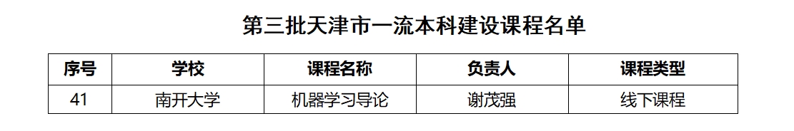 市教委公布了第三批天津市一流本科建设课程名单,我院谢茂强老师的《机器学习导论》课程获批天津市一流本科建设课程。