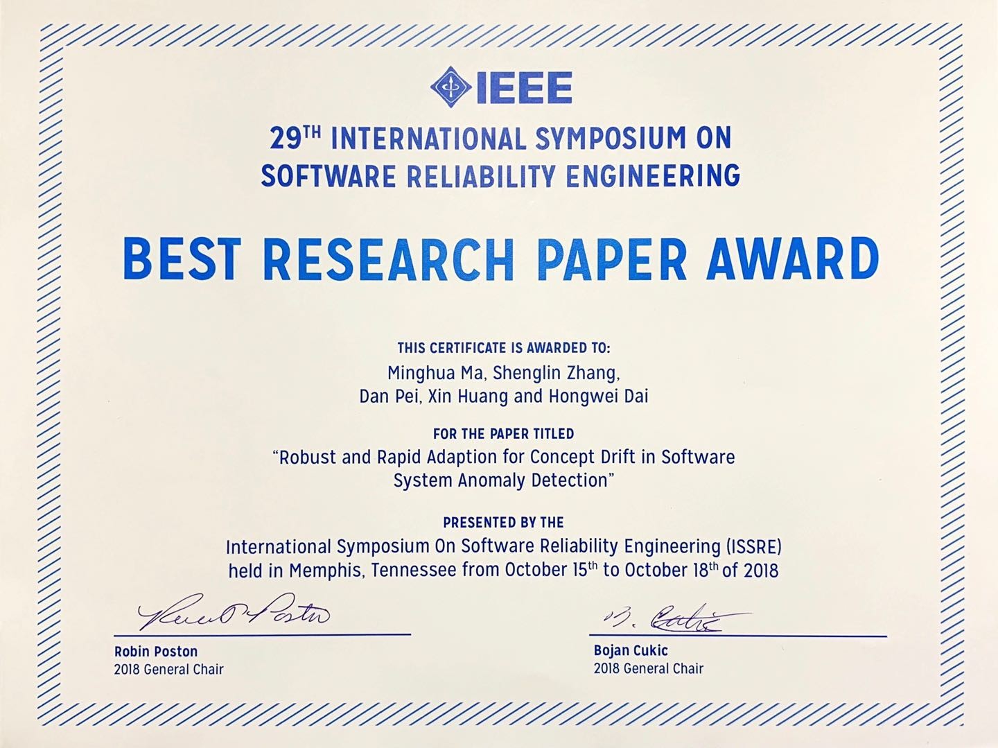 2018年10月15日-18日,在美国孟菲斯市举办的第29届国际软件可靠性工程旗舰会议——IEEE International Symposium on Software Reliability Engineering (ISSRE 2018, CCF推荐软件工程领域B类国际会议)上,betway中国西汉姆联教师张圣林博士与清华大学计算机系裴丹教授、马明华博士,以及搜狗公司高级研发工程师黄昕、代红伟合作发表的论文“Robust and Rapid Adaption for Concept Drift in Software System Anomaly Detection”获得最佳学术论文奖(Best Research Paper Award)。张圣林老师为该论文的通讯作者。该论文为张圣林老师发表在ACM CoNEXT 2015论文工作上的拓展工作。
