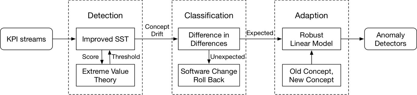 该论文提出了一种新型的研究框架——StepWise。StepWise 能快速且准确地适应异常检测系统面临概念偏移(Concept Drift)的问题。概念偏移是指异常检测的对象 KPI(关键业务指标)时序数据发生剧变。概念漂移会直接导致异常检测系统的准确率降低,而StepWise能够使得异常检测算法快速适应并恢复到原来的准确率。 StepWise能应对各种类型的异常检测算法。下图是 StepWise 的设计框架。