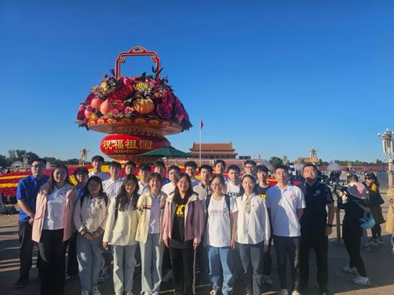 活动当天,党员们还前往天安门广场学习参观,瞻仰人民英雄纪念碑,观赏了天安门广场国庆花坛。在人民英雄纪念碑前,党员们深切缅怀了为中国人民和中华民族争取民族独立解放、人民自由幸福和国家繁荣富强献出宝贵生命的英雄烈士,激发了新时代学生党员的责任感与使命感。党员们怀着崇敬的心情在天安门广场合影,并为母校送上真挚的祝福。