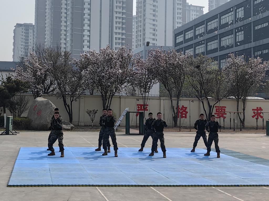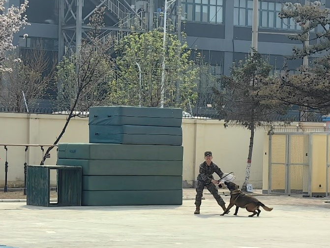 武警官兵展示了日常训练科目。整齐划一的队列动作和响亮的口号声展现出战士们磅礴的气势风采。擒敌拳展示中,战士们犀利的目光、干净利落的擒敌动作令在场师生深受震撼。警犬跟随武警战士清晰的指令灵活穿越障碍,勇猛完成进攻扑咬等动作,反应迅速,动作精准,表现出武警战士与“无声战友”的默契、信任与担当!武警官兵顽强拼搏的精神和过硬的技能本领令在场师生肃然起敬!