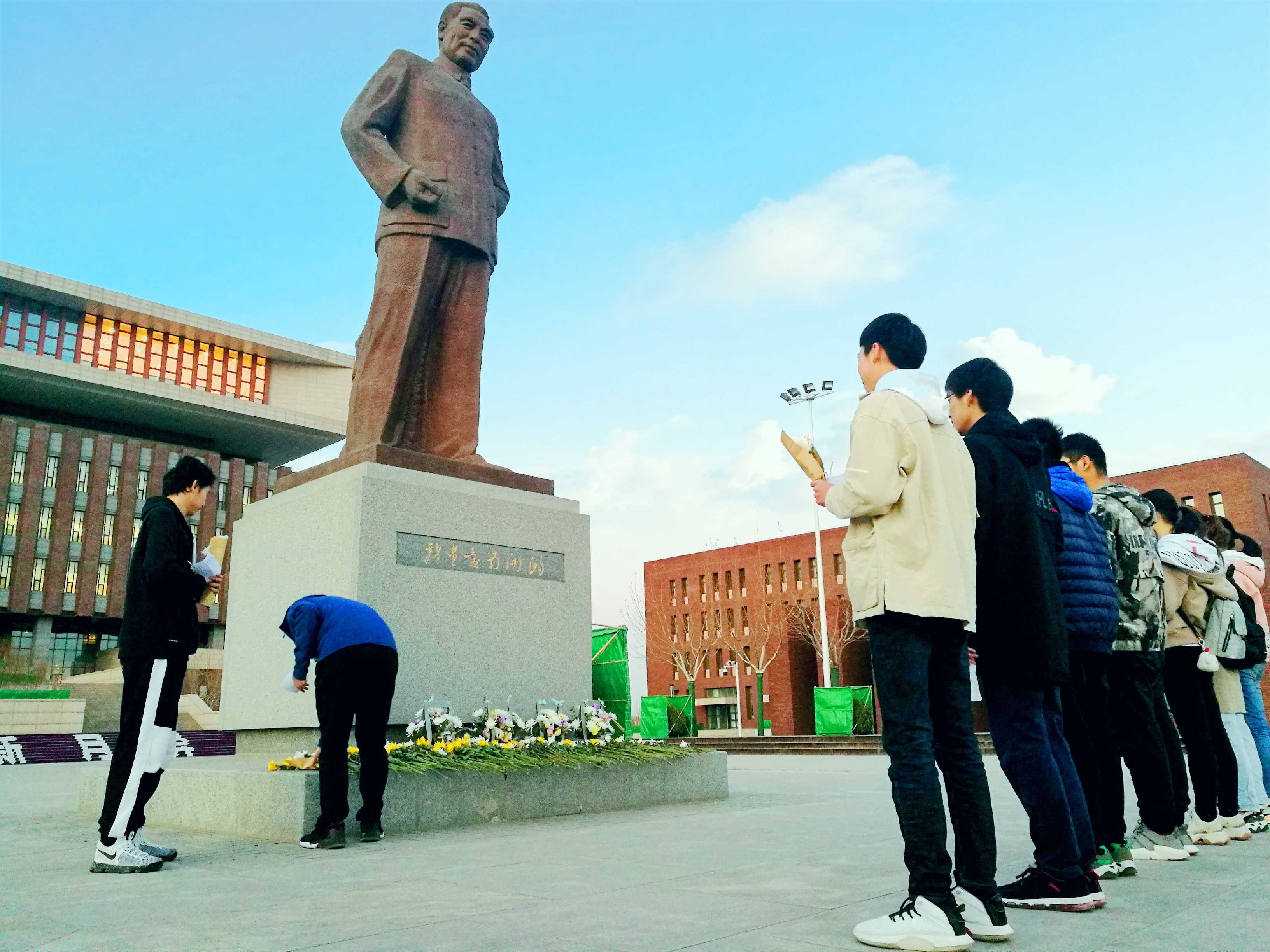 总理诞辰当天,betway中国西汉姆联师生手持鲜花来到了总理像前,开展了纪念周恩来总理诞辰121周年——献花缅怀活动。津南校区总理像前,2018级学生代表李柏锋带领同学们声情并茂地朗诵纪念诗歌 ——“天地中华一英才,抚今追昔有恩来。俯首甘为孺子牛,仰止高山最气派”并回顾了总理的生平,表达了对周恩来总理真切热烈的钦佩。活动后,师生代表同向周恩来总理雕像献花默哀。
